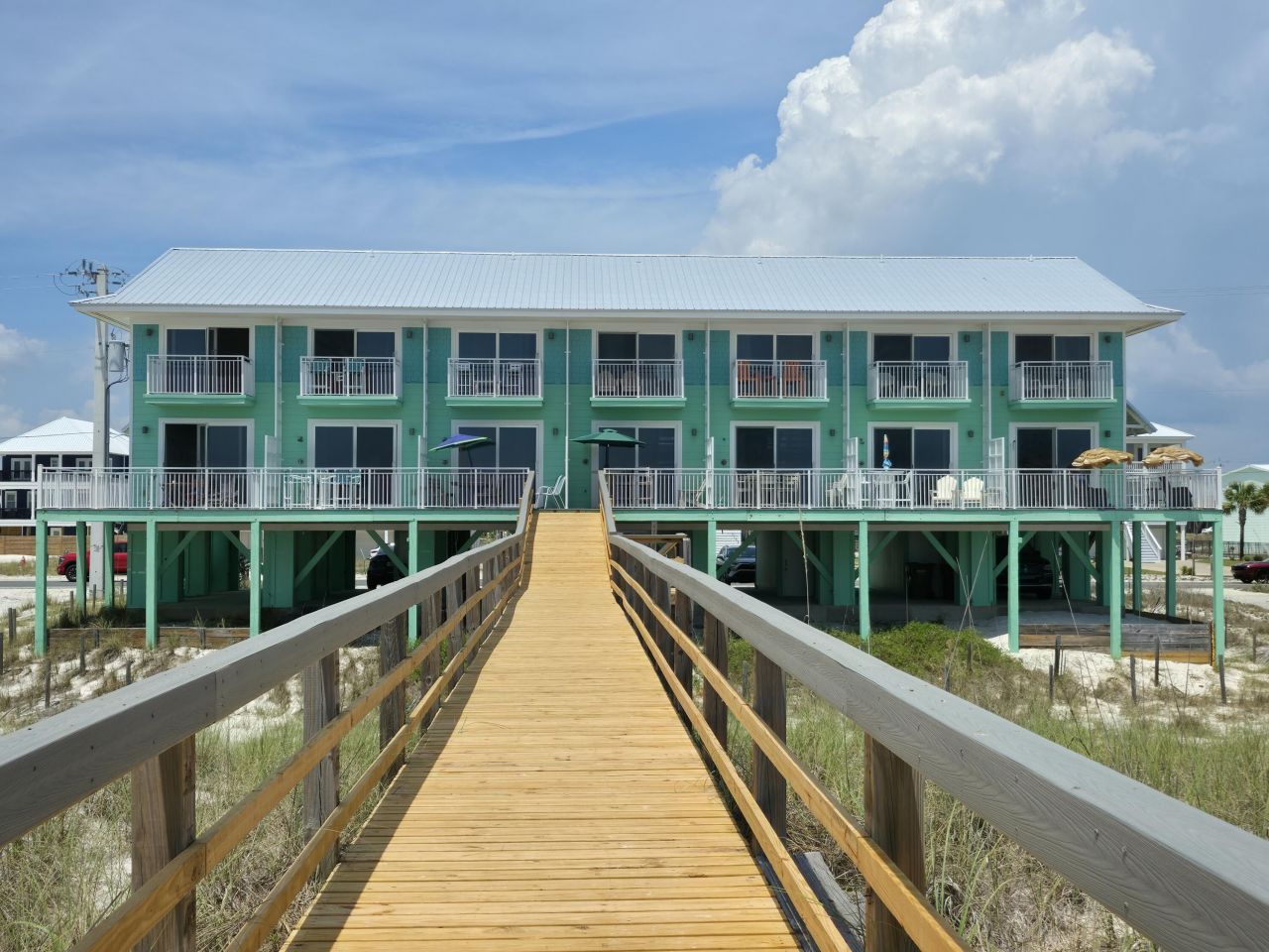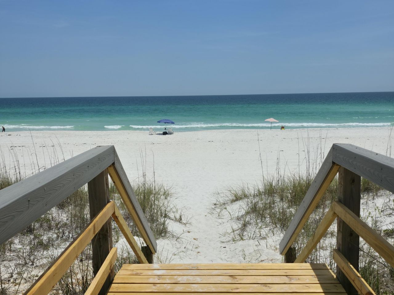 Southern Breeze Townhome located on the beautiful white sand beaches of the Gulf of America! Exceptional coastal retreat! Uncrowded beach. Casual coastal decor, 1 bedroom, 1 1/2 bath, 2nd floor living area with 9' ceilings, 8'sliding glass doors, granite counter tops, recessed lighting, tile floors, half bath with pedestal sink. Wood stairs with stainless steel hand railing leads up to the master bedroom! Comfortable king bed, large screen TV and DVD. Master bedroom balcony overlooking the beautiful Gulf of America! Zero maintenance treks decking. Metal roof replaced 2024. Hardy plank siding. Only 6 one-bedroom gulf front townhomes on Navarre...read more